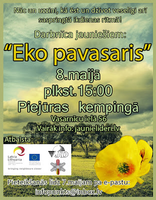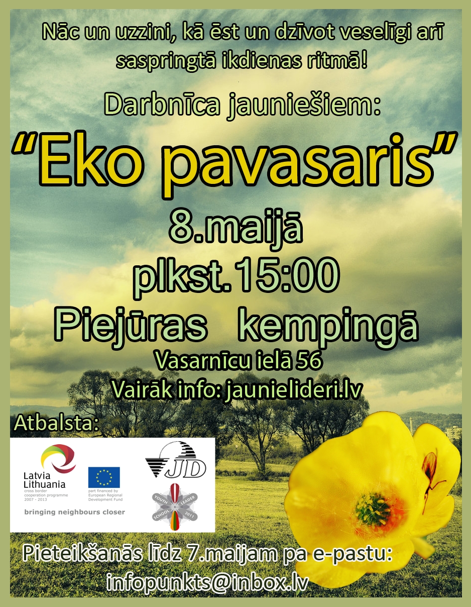 Otrdien, 8. maijā, pēcpusdienā Ventspils “Piejūras kempingā” notiks radošā darbnīca jauniešiem „Eko pavasaris”. Darbnīcā piedalīsies ap 30 jauniešiem un tās laikā tiem būs iespēja uzzināt un diskutēt par veselīgu dzīvesveidu – veselīgu uzturu, veselību stiprinošām fiziskām aktivitātēm un veselīgu domāšanu.