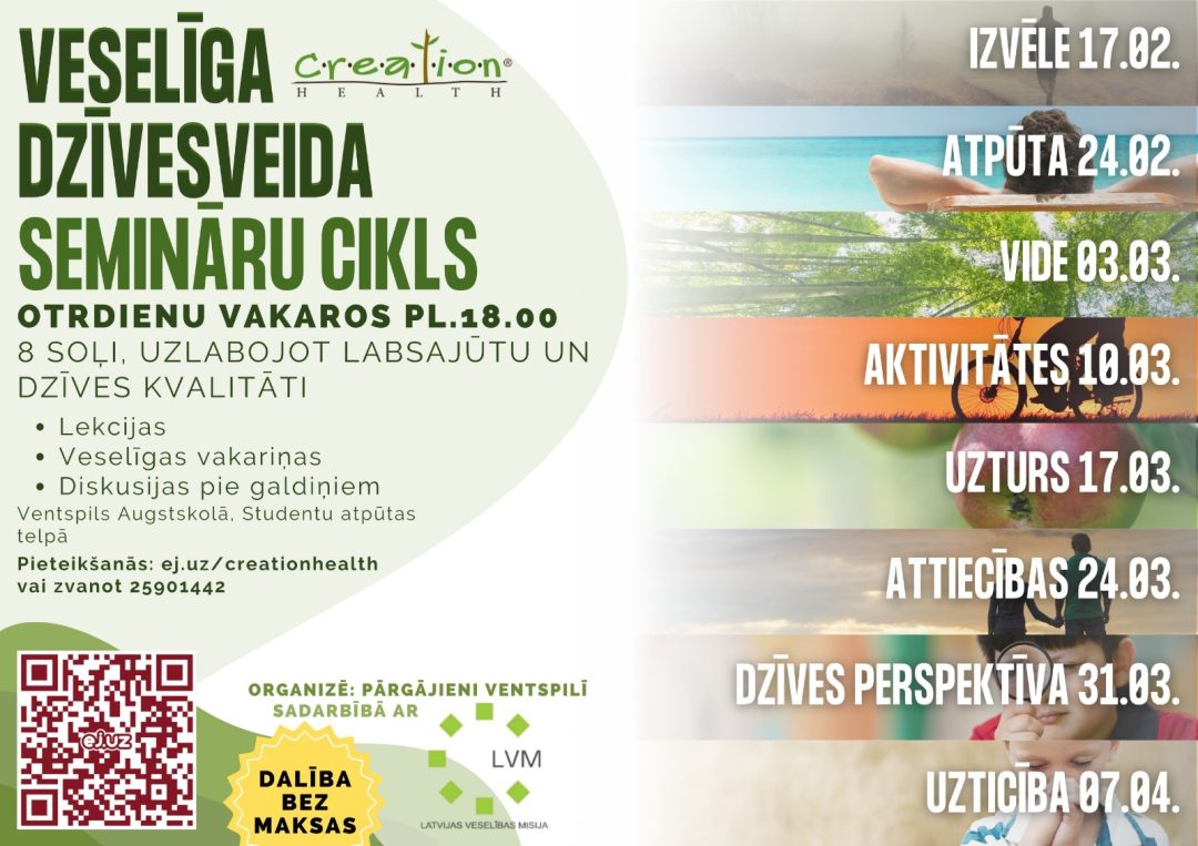 No š.g. 17. februāra līdz 7. aprīlim otrdienu vakaros pl.18.00 aicinām pievienoties veselīga dzīvesveida semināru ciklam Creation Health (Radīšanas veselība). Šajās tikšanās reizēs varēsiet baudīt veselīgas, vieglas vakariņas, interaktīvas lekcijas, kurās tiks aplūkoti 8 veselīga dzīvesveida pamatprincipi un diskusijas pie galdiņiem, kas palīdzēs saprast, kā šos principus padarīt reālākus savā ikdienā.